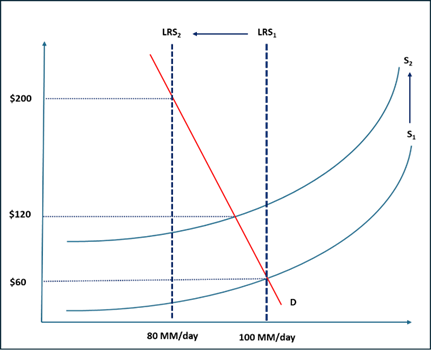 The chart shows what taking-out twenty percent of global supply, which can neither be rebuilt quickly nor satisfied elsewhere, will do to prices. The short-run supply curve moves to the left (S1 to S2) and prices double ($60 to $120). While supply may fall below the 100 MM barrels a day needed to power the globe, the price does not capture a long-lasting loss of supply as the market has bet supply will roar back at the end of hostilities (despite production infrastructure damage in the Gulf.) This is today’s bet.